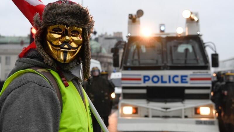 A masked protestor stands in front of a police vehicle in Paris on January 5, 2019, during a rally by yellow vest "Gilets Jaunes" anti-government protestors. (Bertrand GUAY / AFP)