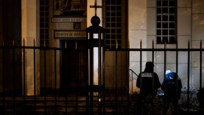 Police officers examine the entrance of the Orthodox Church where an attacker armed with a sawn-off shotgun wounded an Orthodox priest in a shooting before fleeing, on October 31, 2020 in Lyon, said a police source. (AFP/File)