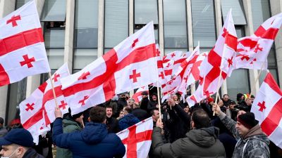 Georgian opposition supporters wave national flags reacting on the announcement of Prime Minister Giorgi Gakharia's resignation in front of the United National Movement (UNM) headquarters in Tbilisi on February 18, 2021. Vano Shlamov / AFP