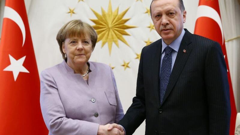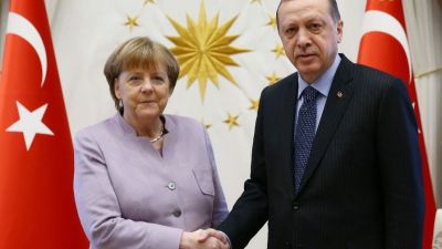 Turkish President Recep Tayyip Erdogan shakes hands with German Chancellor Angela Merkel in Ankara. (AFP Photo/KAYHAN OZER)