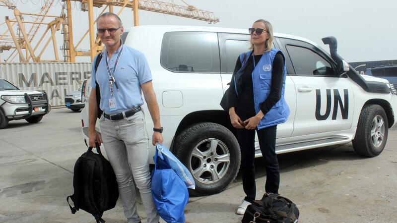 Representatives of the UN Redeployment Coordination Committee (RCC) arrive to attend a joint meeting with representatives of the Yemeni government and the Huthi rebels in Yemeni port city of Hodeida (AFP)