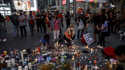 People lay flowers, candles, and shoes at an impromptu vigil as part of "No Pride in Genocide" event in Toronto, Ontario, Canada, July 1, 2021, to encourage reflection on Canada's treatment of indigenous people following the discovery of unmarked graves at residential schools in Canada. Cole Burston / AFP