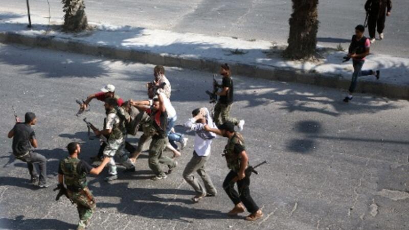 Rebel Free Syrian Army fighters drag a man suspected of being a shabiha or pro-regime militiamen on 31 July in Aleppo. [Emin Ozmen AFP/Getty Images]