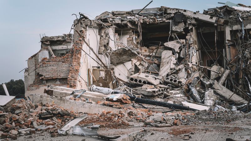 The wreckage of a destroyed building. Ruins in the background. (Shutterstock)