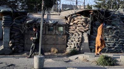 Men walk pass a checkpoint near Afghanistan's Ministry of Foreign Affairs in Kabul on September 14, 2021. (Photo by Karim SAHIB / AFP)