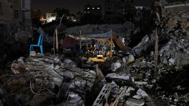 Palestinians sit in a tent that has been set up on top of the ruins of a building destroyed in recent Israeli air strikes, in Gaza City, on May 24, 2021. A ceasefire was reached late last week after 11 days of deadly violence between Israel and the Hamas movement which runs Gaza, stopping Israel's devastating bombardment on the overcrowded Palestinian coastal enclave which, according to the Gaza health ministry, killed 248 Palestinians, including 66 children, and wounded more than 1,900 people. Meanwhile, rockets from Gaza claimed 12 lives in Israel, including one child and an Israeli soldier. MOHAMMED ABED / AFP