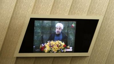 IRAN, Tehran : Iranian President Hassan Rowhani is seen on a TV screen as he speaks during a parliament session to elect the cabinet members on August 15, 2013. AFP PHOTO/BEHROUZ MEHRI