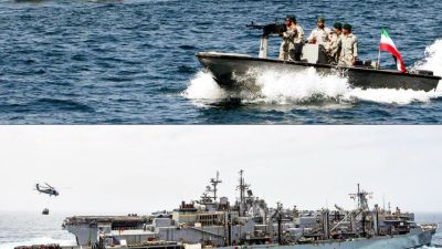 This combination of file pictures created on July 22, 2019, shows Iranian soldiers taking part in the "National Persian Gulf day" in the Strait of Hormuz, on April 30, 2019 (up) and the amphibious assault ship USS Boxer (LHD 4) receiving a vertical replenishment-at-sea in the Arabian Sea on July 14, 2019. (US Navy photo via AFP)
