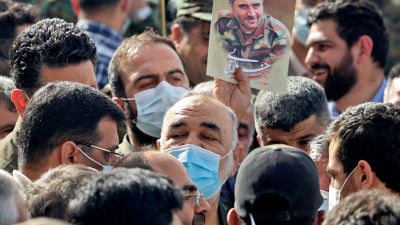 Hossein Salami, head of Iran's Revolutionary Guard Corps (IRGC), takes part in Revolutionary Guards colonel Sayyad Khodai's funeral procession at Imam Hussein square in the capital Tehran, on May 24, 2022. (Photo by ATTA KENARE / AFP)