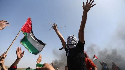 Palestinian demonstrators wave their national flag and shouts slogans against Israeli security forces during a protest on the Israel-Gaza border in the northern Gaza Strip on April 6, 2018. (AFP/Mohammed Abed)