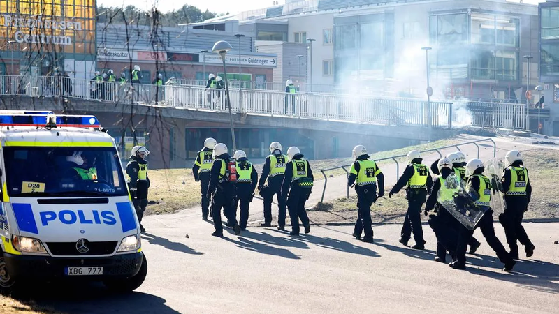 Riot police pass a barricade to enter a shopping center during rioting in Norrkoping, Sweden on 17 April 2022. [STEFAN JERREVANG/TT News Agency/AFP via Getty Images]