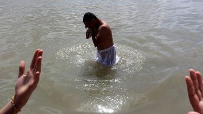 Iraqis Sabeans, followers of a pre-Christian religion which considers the prophet Abraham as one of the founders of their faith, stands in the water as he prays to mark Eid Al-Khalqeh (creation of the world) on the banks of the Tigris River in Baghdad. (AFP/File)