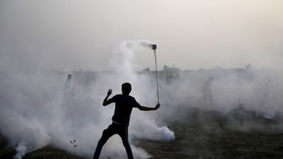 A Palestinian protester uses a slingshot in the smoke billowing from tear gas shot by Isreali forces during a demonstration along the border between Israel and the Gaza strip, east of Gaza City, on May 25, 2018. (MOHAMMED ABED / AFP)