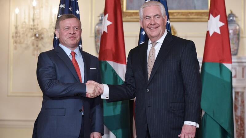 US Secretary of State Rex Tillerson (R) poses for a photo with Jordan's King Abdullah II ahead of a working lunch at the State Department in Washington, DC on April 4, 2017. (AFP/Mandel Ngan)