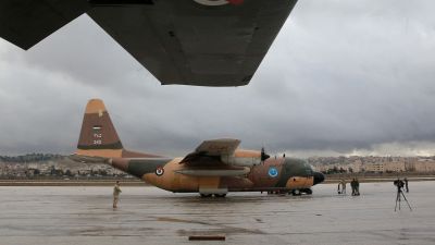 A Jordanian military plane carrying humanitarian aid for Syria following a deadly earthquake, prepares to take off at Marka military airport in Amman, on February 8, 2023. The death toll from the massive earthquake that struck Turkey and Syria rose above 8,300, official data showed, with rescue workers still searching for trapped survivors. (Photo by Khalil MAZRAAWI / AFP)