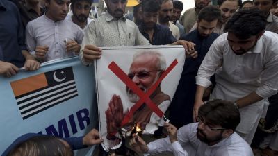 Students of Islami Jamiat-e-Talaba (IJT), a wing of religious political party Pakistan Jamaat-e-Islami (JI), burn a photograph of Indian Prime Minister Narendra Modi during a protest in Peshawar (AFP)