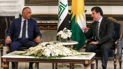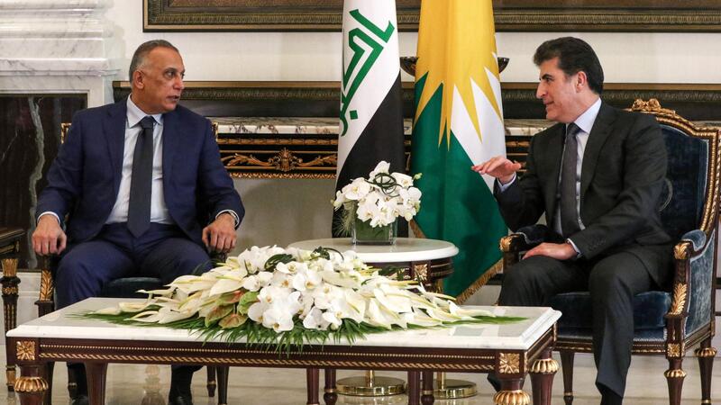 Nechirvan Barzani (R), President of Iraq's autonomous Kurdistan Region, meets with Iraqi Prime Minister Mustafa Kadhemi (L) in Arbil, the capital of the northern Iraqi Kurdish autonomous region, on March 14, 2022. (Photo by SAFIN HAMED / AFP)