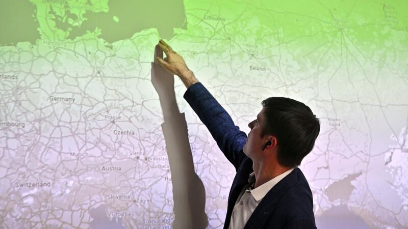 Ukraine's deputy agriculture minister Taras Vysotskiy shows alternative routes for grain exports on a map in Kyiv on June 24, 2022. (Photo by Sergei SUPINSKY / AFP)