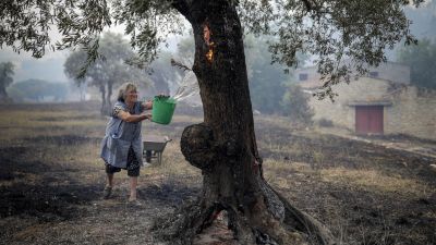 A resident uses a bucket of water to put out embers on olive trees in Moinhos Joao da Serra, in Ourem, on July 13, 2022. (Photo by PEDRO ROCHA / AFP)