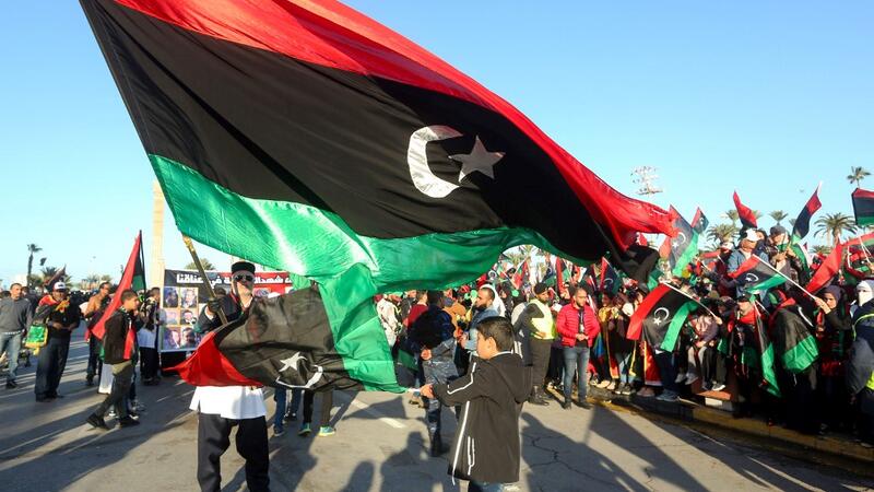 In this file photo taken on February 17, 2020, Libyans wave the national flag as they commemorate the ninth anniversary of the uprising against former Libyan leader Moamer Kadhafi, in Tripoli on February 17, 2020. Mahmud TURKIA / AFP