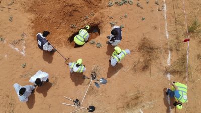 An aerial view shows Libyan experts searching for human remains during the exhumation of mass graves in Tarhuna, southeast of the capital Tripoli, on June 23, 2020. (AFP)