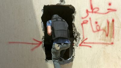 A Turkish deminer enters a house through a hole in the wall with a warning about the presence of mines in the Salah al-Din area, south of the Libyan capital Tripoli, on June 15, 2020. Human Rights Watch earlier this month accused pro-Haftar forces of laying Russian and Soviet-era landmines as they withdrew from Tripoli's southern districts. A team of Turkish deminers arrived in Tripoli last week to bring their expertise, under a broader military cooperation agreement signed late last year between Tripoli and Ankara. / AFP / Mahmud TURKIA RELATED CONTENT