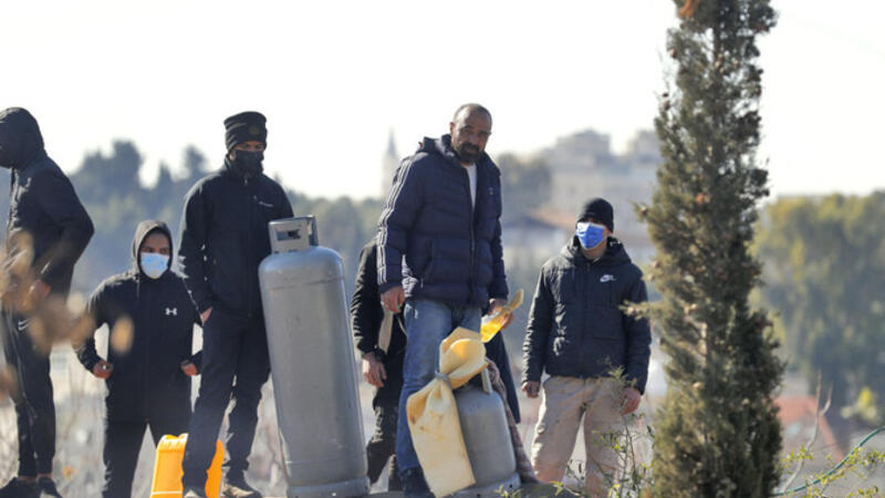 Palestinian men hold a gas tank on the roof of a house as Israeli police prepare to evict a family from the same building on Jan. 17, 2022 in Sheikh Jarrah. (Ahmad Gharabli / AFP)