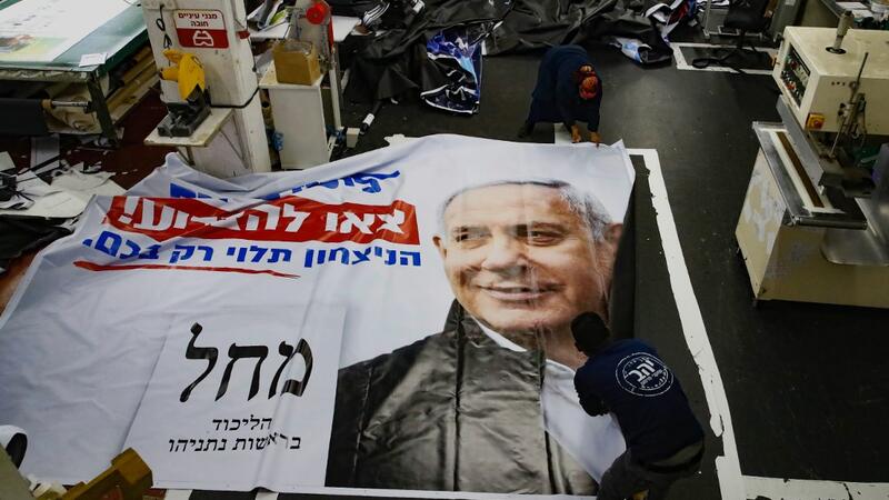 Israeli workers prepare an election banner for the Likud party showing the face of its leader Israeli Prime Minister Benjamin Netanyahu, at a printing factory in the central Israeli city of Petah Tikva, on February 20, 2020. JACK GUEZ / AFP