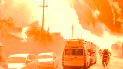 A video of the second blast was shared online showing figherfighters and rescue workers attempting to put down massive fire at a liquified natural gas site in Bucharest before it expoded.