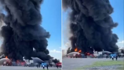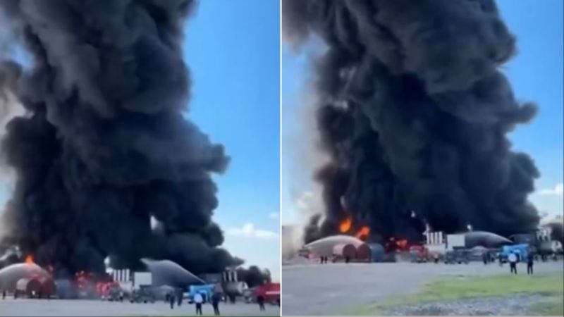 A video was posted on X showing flames and black smoke rising into the sky from an oil refinery.