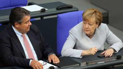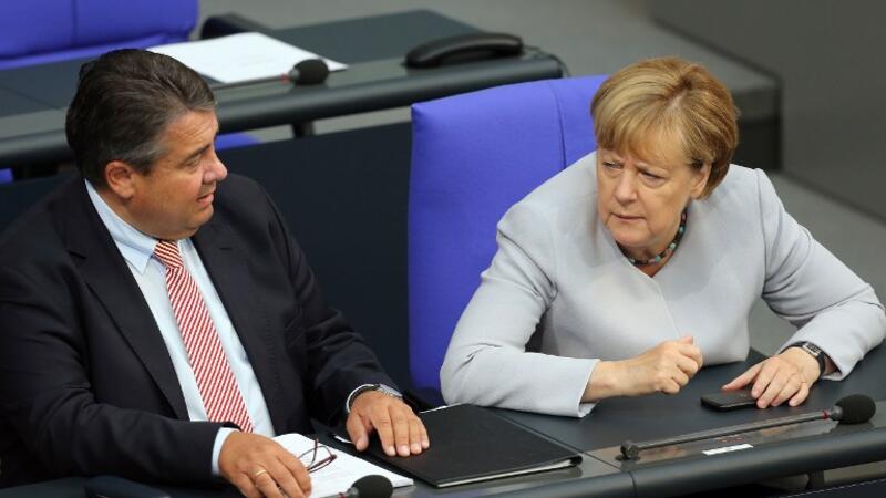 German Chancellor Angela Merkel (R) talks with German Vice Chancellor, Economy and Energy Minister Sigmar Gabriel during a session of the Bundestag (lower house of parliament) on September 8, 2016 in Berlin. (AFP/Wolfgang Kumm)