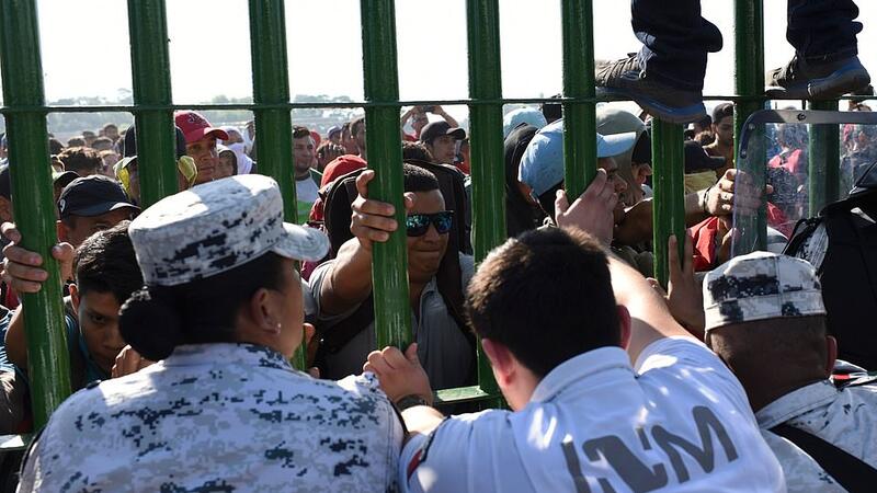 Footage from Saturday morning showed a group of migrants jostling and clashing with members of Mexico's National Guard on the bridge separating Guatemala from Mexico. Women carrying small children could be seen at the front of the group on the bridge.