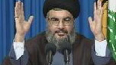 He was addressing a rally of supporters and representatives of allied forces at a soccer stadium in south Beirut. Nasrallah appeared on huge screens erected at the stadium.