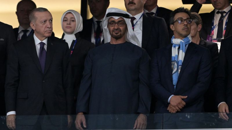 Turkey's President Recep Tayyip Erdogan (L), UAE President Sheikh Mohamed bin Zayed al-Nahyan (C) Manchester City's Emirati owner Sheikh Mansour bin Zayed al-Nahyan attend the UEFA Champions League final football match between Inter Milan and Manchester City at the Ataturk Olympic Stadium in Istanbul. (Photo by OZAN KOSE / AFP)