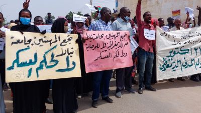 Sudanese demonstrators march in the streets of Nyala, the capital of South Darfur, to demand the government's transition to civilian rule, on October 21, 2021. (Photo by Abdelmonim MADIBU / AFP)