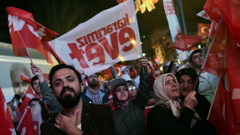 Supporters of Turkish President Erdogan wave Turkish national flags and flags reading "yes" as they celebrate during a rally on April 16, 2017 in Istanbul after the results of a nationwide referendum. (AFP/Ozan Kose)