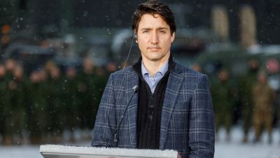 Canada's Prime Minister Justin Trudeau addresses a press conference at the end of a visit of the Adazi military base, north east of Riga, Latvia, on March 8, 2022. (Photo by Toms Norde / AFP)