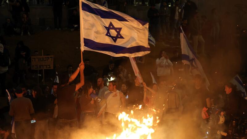 Protesters block a road and hold national flags as they gather around a bonfire during a rally against the Israeli government's judicial reform in Tel Aviv, Israel on March 27, 2023. (Photo by AHMAD GHARABLI / AFP)