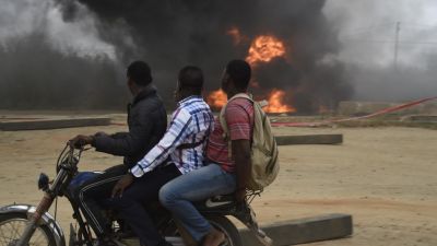 A taxi motorcyclist, popularly called Okada, drives past a tanker laden with petrol that is on fire after it fell over and spilt the contents across the Lagos-Ibadan expressway in Magboro, Ogun State, on December 2, 2020.PIUS UTOMI EKPEI / AFP