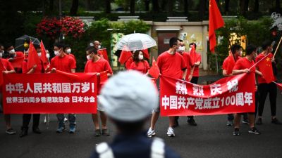 The centenary celebrations in Beijing began with a fly-by of helicopters in formation spelling “100” in the skies above the cheering crowds, trailing flags and colored smoke over Tiananmen Square, and a 100-gun salute followed.