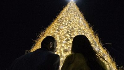 People gather by the giant hollow Christmas tree set up in Iraq's predominantly Christian town of Qaraqosh (Baghdeda), in Nineveh province, some 30 kilometres from Mosul, on December 7, 2021. (Photo by Zaid AL-OBEIDI / AFP)