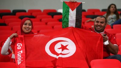 Football fans hold up the flags of Tunisia (Bottom) and Palestine (Top) during the FIFA World Cup 2022 play-off qualifier football match between UAE and Australia at Ahmad bin Ali stadium in Qatar's Ar-Rayyan on June 7, 2022. (Photo by Mustafa ABUMUNES / AFP)