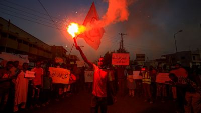 A demonstrator lights a flare while chanting slogans during a protest outside the Sudanese Professionals Association in the Garden City district of Sudan's capital Khartoum on July 4, 2020, in solidarity with the people of the Nertiti region of Central Darfur province in the country's southwest. AFP / ASHRAF SHAZLY