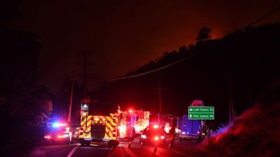Fire trucks and emergency vehicles huddle on the road as the horizon is set ablaze by the Lake Fire flames in the Angeles National Forest, by Lake Hughes, 60 miles north of Los Angeles, California on August 12, 2020. Robyn Beck / AFP