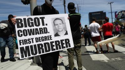 A protestor holds a sign with a photo of former Minneapolis police officer Derek Chauvin during demonstrations following the death of George Floyd on May 30, 2020 in Los Angeles, California. Chauvin was taken into custody for Floyd's death. (MARIO TAMA / GETTY IMAGES NORTH AMERICA / Getty Images via AFP)