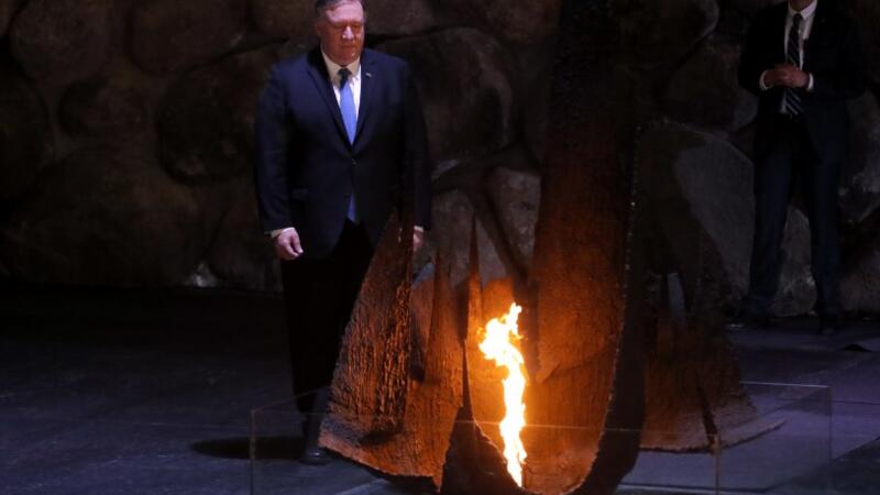 US Secretary of State Mike Pompeo stands next to the eternal flame at a ceremony commemorating the six million Jews killed by the Nazis during the Holocaus (AFP)