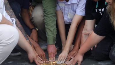 The golden-colored plaque, featuring a hand giving the three-fingered salute that has been adopted by the protest movement, declared that Thailand belongs to the people rather than the king.