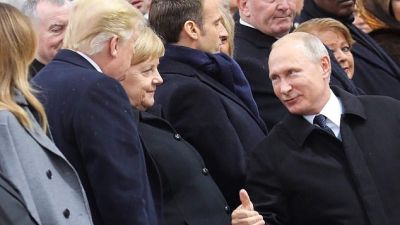 The last to arrive was Russia's Putin, who shook hands with Macron, Merkel and then Trump, briefly giving the U.S. leader a thumbs up.