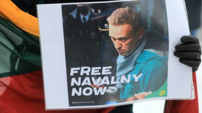 A participant holds a poster with a photo taken by AFP photographer Kirill Kudryavtsev on January 17, 2021, which shows Russian opposition leader Alexei Navalny upon arrival at Moscow's Sheremetyevo airport, during a demonstration in support of Navalny, who is currently jailed, in front of the Russian embassy in Vilnius, on January 23, 2021. Small protests in support of jailed Kremlin critics Alexei Navalny were held in the Baltic states of Lithuania ad Estonia on January 23. Navalny, 44, called on his allies to take to the streets after he was detained in a Moscow airport last weekend. He was arrested moments after arriving from Germany, where he had been flown in August to recover from a near-fatal poisoning with the Soviet-designed nerve agent Novichok. PETRAS MALUKAS / AFP
