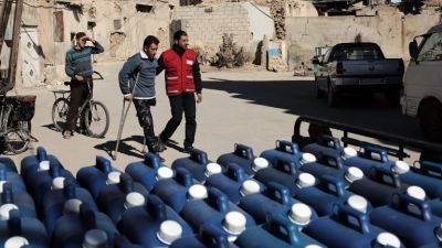 A member of the Qatari Red Crescent delivers aid, in the form of diesel fuel, to families in need in the rebel-held town of Beit Sawa, on the outskirts of the capital Damascus on March 7, 2016. (AFP/Amer al-Mohibany)